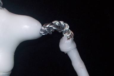 This is the Loc-Line spine. While the armature was under construction, there were five sections to the spine, when it was completed, I felt that the proportions were wrong, and that her back was too long, so I popped her apart, removed two sections, and clicked her back together.