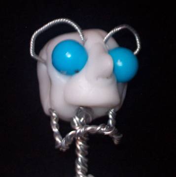 The head has been made by embedding wire into a large ball of polymorph. The eyes were eventually made from white glass beads, but I have used blue beads here to make the photograph clearer. The brow wire was not a huge success, and I actually removed it in the final puppet, The nose and upper palate section were added on while the polymorph was still very soft, and the eyes were nestled into place before it cooled. The jaw wire runs right up to the back of the skull, and the ends have been splayed out. The neck wire runs into the back of the head, and the ends of the wire have also been splayed out to really grip into the polymorph. It's a little clearer in the photograph below, as the Polymorph becomes a little translucent when it is hot.