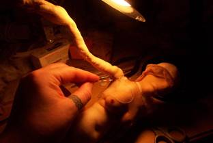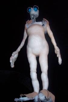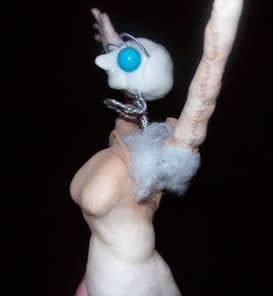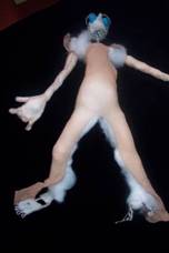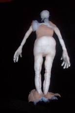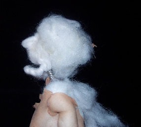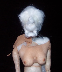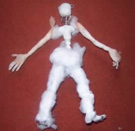 The first stage in skinning the puppet is to glue the hollow fibre wadding to the Polymorph bones. Here, you can see the uncovered head and torso, the glued on wadding on the legs, and the arms completed with their nylon skin. You need to make the limbs much thicker than the final desired result, as this technique really relies on a lot of tension inside the nylon stocking. At an early stage, you need to think like a sculptor, adding balls of wadding where you know you will need volume. If you look at the picture to the right, you will see that I have added a ball of stuffing over her buttocks, and high on her left calf. These have been roughly stitched in place with a needle and thread. At this point, stick with it ..it becomes much easier to control once you have added the nylon skin.