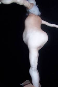 I then covered her head in a new section of stocking, and pulled that right down and tucked it under her boobs, and stitched it to her under-wire. I then trimmed the loose edges from her arms, and using the smallest neatest stitches possible, I joined up the raw edges. I then ran a seam down the back of her head and neck, pulling the material as tightly as I could. The hands and feet are made in exactly the same manner, pulling the stocking material around the armature and stitching it into place.