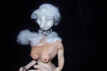 At this stage, I have stitched up her back, and slimmed her down. Her boobs were made by wrapping a wire around the torso, and securing it with polymorph. It works almost exactly like an under wired bra, except her boobs are glued to it . Unfortunately I didn't manage to photograph that bit, but you can just make out the wire running down the side of her boob. The shape was achieved by making two little balls in the wadding, wrapping them in little bits of nylon, stitching them up the back, then sticking them to the under wire. A thin layer of wadding was then stitched in place over her chest, and the stocking was pulled up over the top. Her nipples were made with sculpy, which actually burned in the oven, but wound up with a rosy glow, so I used them in the end.