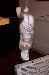 Here, the puppet is hanging over a heater after a hair touch up. Notice that I have wrapped her up in cling film, and masked her face. You really can't afford to get paint on the puppet when it's made in fabric.