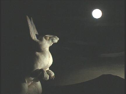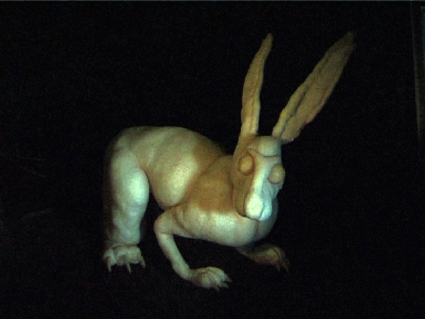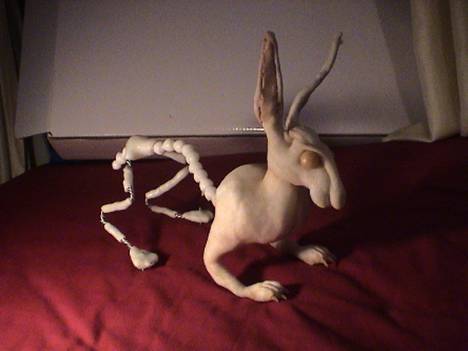 The hare armature was constructed with the same materials, and he was skinned in exactly the same manner, except all his seams run under his belly. His eyes and claws are made from sculpy. The following photos show him under construction.