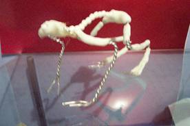 The hand is made in the same manner, but what is difficult to see from this picture is what is going on inside the lower arm. The polymorph is actually joining two separate bits of wire. It was designed in this way to allow the hand to be replaced if a finger snapped during the shoot. In theory, all the bones could be designed in this manner, although this would make the construction very fiddly and there are other materials and techniques, which make repair jobs easier, such as :