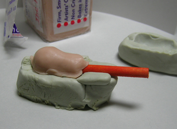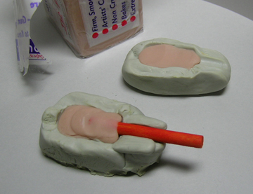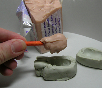 "Before I put clay into it, I spray in mold release. I mush up some premo clay until it is soft and press it inside each half of the mold."